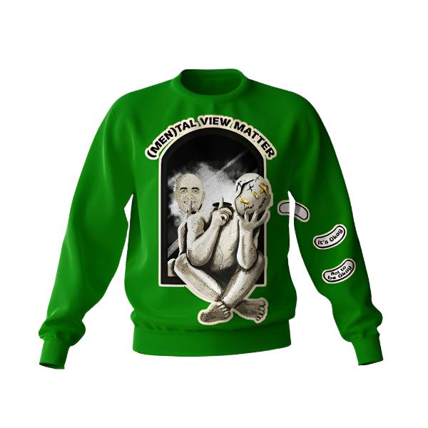 Our green sweatshirt holds within it the essence of the men's mental health journey. It is a visual masterpiece that speaks volumes. As you gaze upon it, you will see a man, sitting in solitude, cradling his cracked head in his weary hands. The rip-up bandage adorning his forehead is a poignant symbol of the battles he faces within. Yet, with unyielding determination, he gently places his finger against his lips, a solemn gesture to silence the chaos within his mind. And as you peer into the mirror behind him, you will discover a profound reflection of self-awareness and growth, a reminder that healing begins from within