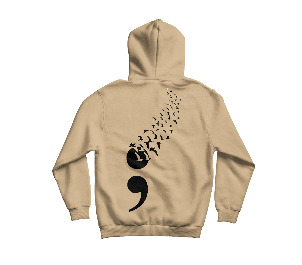 This hoodie features a striking design that combines a semi-colon and black birds flying away, with a single white bird at the top.